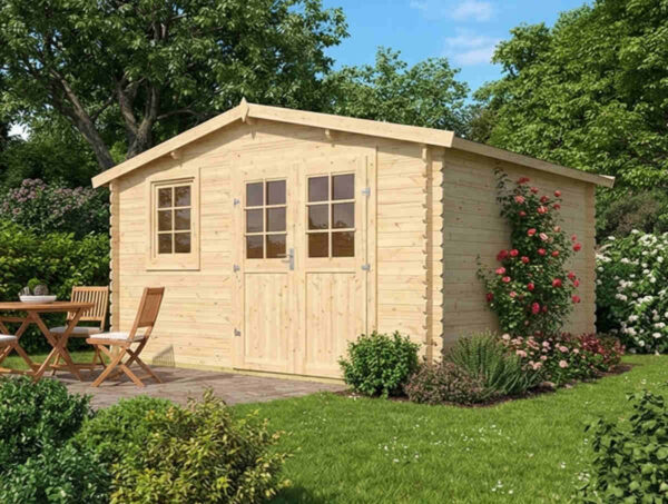 Abri de jardin VALLO en bois avec madriers de 28 mm. Lumineux, sécurisé et décliné de 7,5 à 17 m², idéal pour un rangement pratique et soigné au jardin.