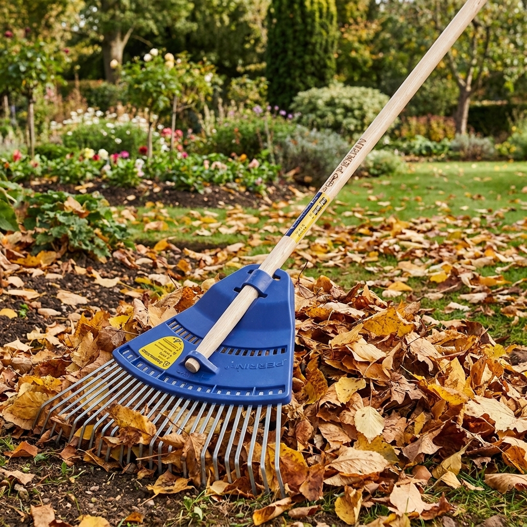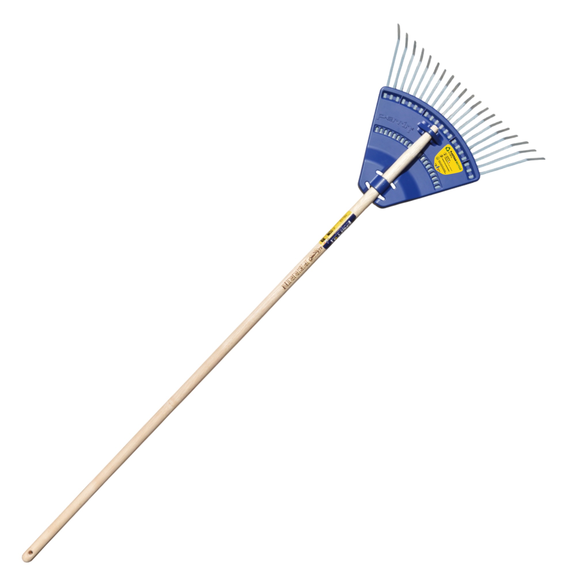 Balai à gazon professionnel avec 22 dents plates et portée droite, idéal pour nettoyer grandes surfaces. Tête renforcée PP/Acier, manche bois PEFC 1,50m, finition hydrosoluble. Fabrication française garantie 5 ans.