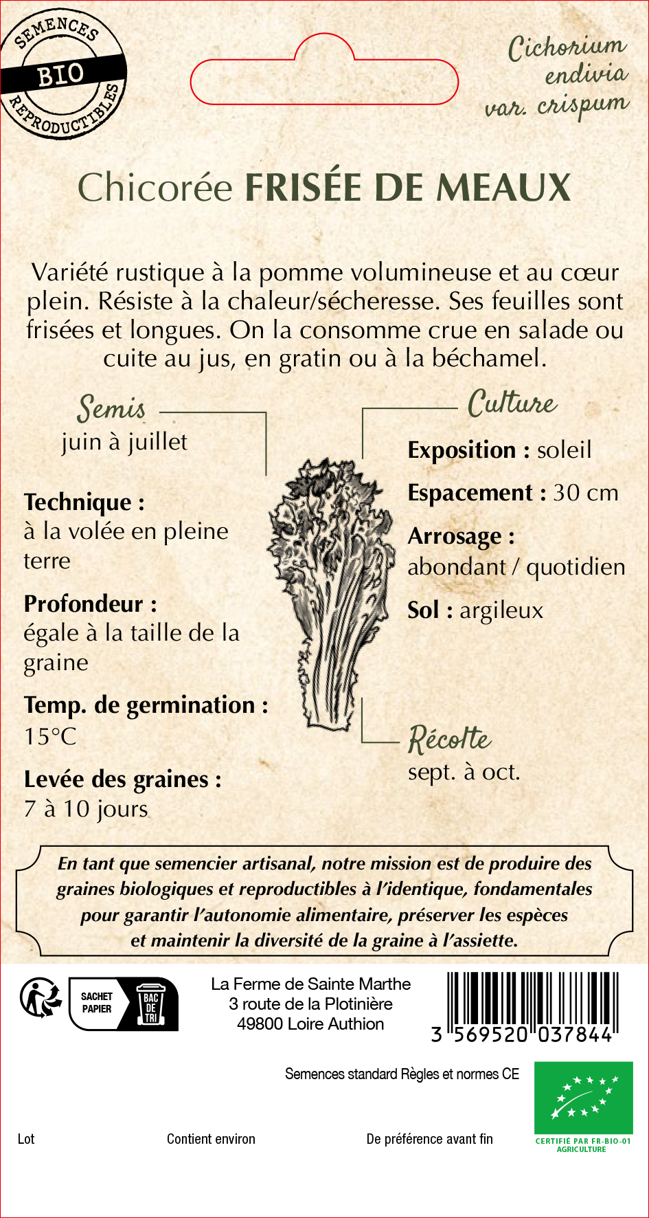 Ce sachet contient 500 graines de chicorée frisée de Meaux certifiées BIO, garantissant une production respectueuse de l'environnement et sans résidus chimiques. Avec une telle quantité, vous disposez de suffisamment de graines pour plusieurs plantations ou pour partager avec d'autres jardiniers passionnés.