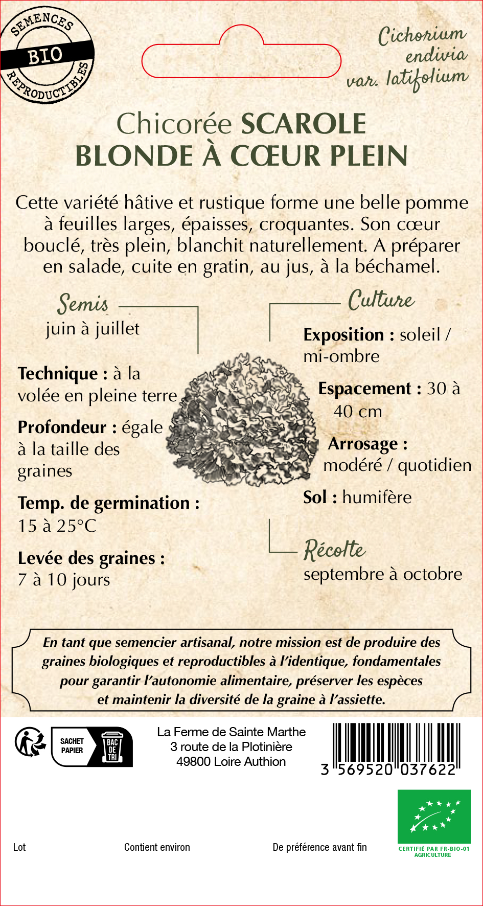 CHICORÉE Scarole Blonde à Cœur Plein robuste avec une pomme généreuse et un cœur plein. Feuilles frisées et allongées parfaites crue en salade ou cuisinées en gratin. 500 graines BIO pour semis juin-juillet, récolte septembre-octobre.