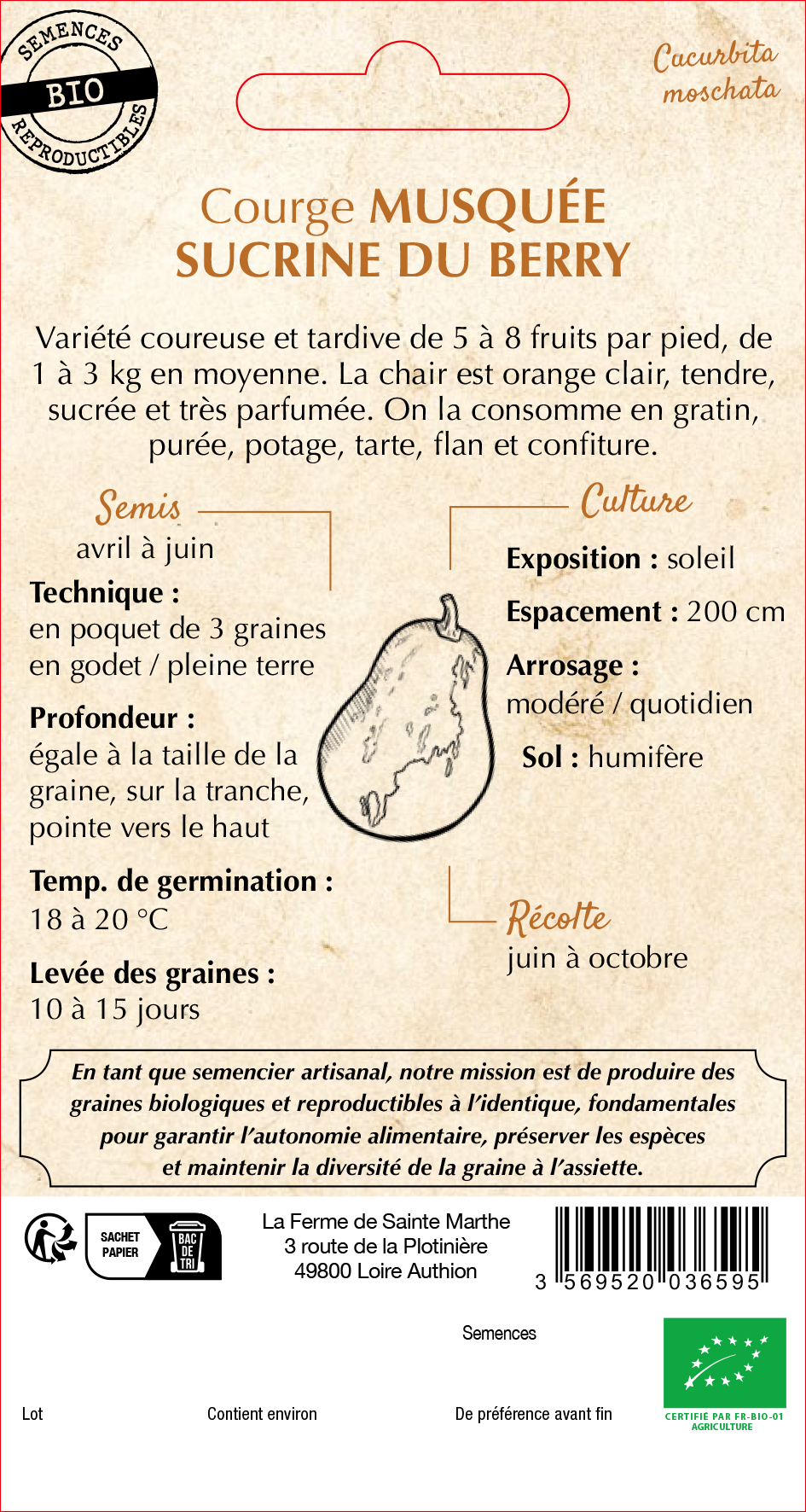 Cette variété traditionelle du Berry bénéficie d'une certification BIO garantissant des graines cultivées sans produits chimiques. Parfaite pour les jardiniers respectueux de l'environnement et des traditions culinaires françaises. Semez vos 15 graines et profitez d'une abondante récolte d'une courge d'exception.
