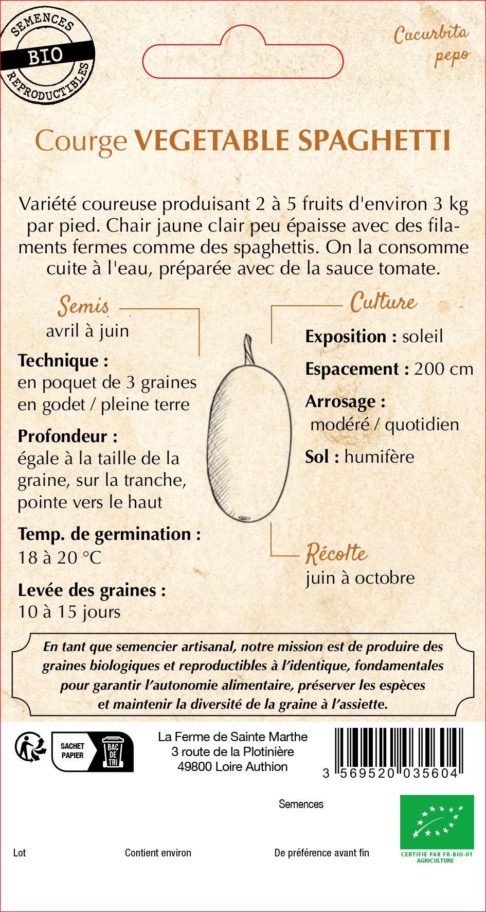Découvrez la courge Vegetable Spaghetti, une variété coureuse produisant 2 à 5 fruits de 3 kg. Sa chair jaune se transforme en filaments fermes rappelant les spaghettis à la cuisson. Parfaite cuite à l’eau avec sauce tomate, cette courge bio offre une expérience culinaire unique et savoureuse.
