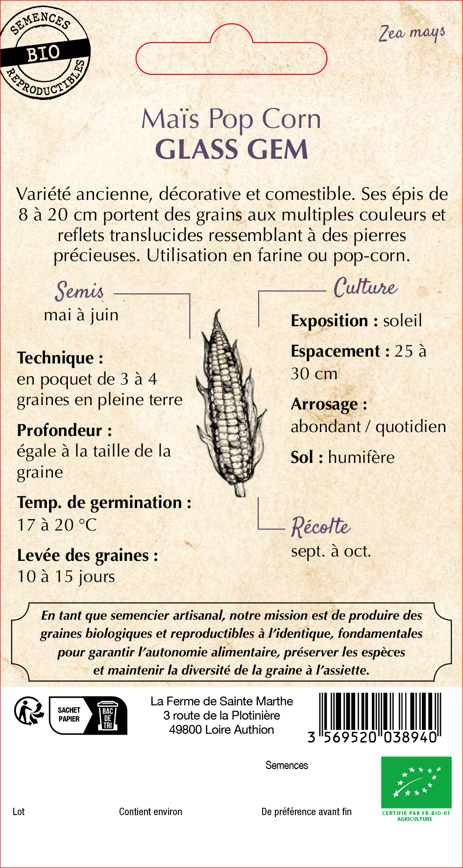 Découvrez le MAÏS POP CORN Glass Gem, une variété ancienne authentique originaire des USA. Cette graine de maïs pop corn unique combine l'esthétique et la saveur, offrant une expérience de jardinage vraiment remarquable.