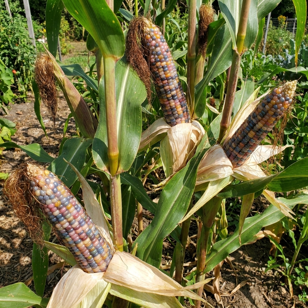 Les épis de 8 à 20 cm de ce maïs décoratif arborent des grains aux couleurs variées avec des reflets translucides spectaculaires. Chaque grain présente une palette naturelle allant du rouge foncé au bleu, créant un effet de vitrail fascinant. Cette variété de pop corn est à la fois ornementale et culinaire.
