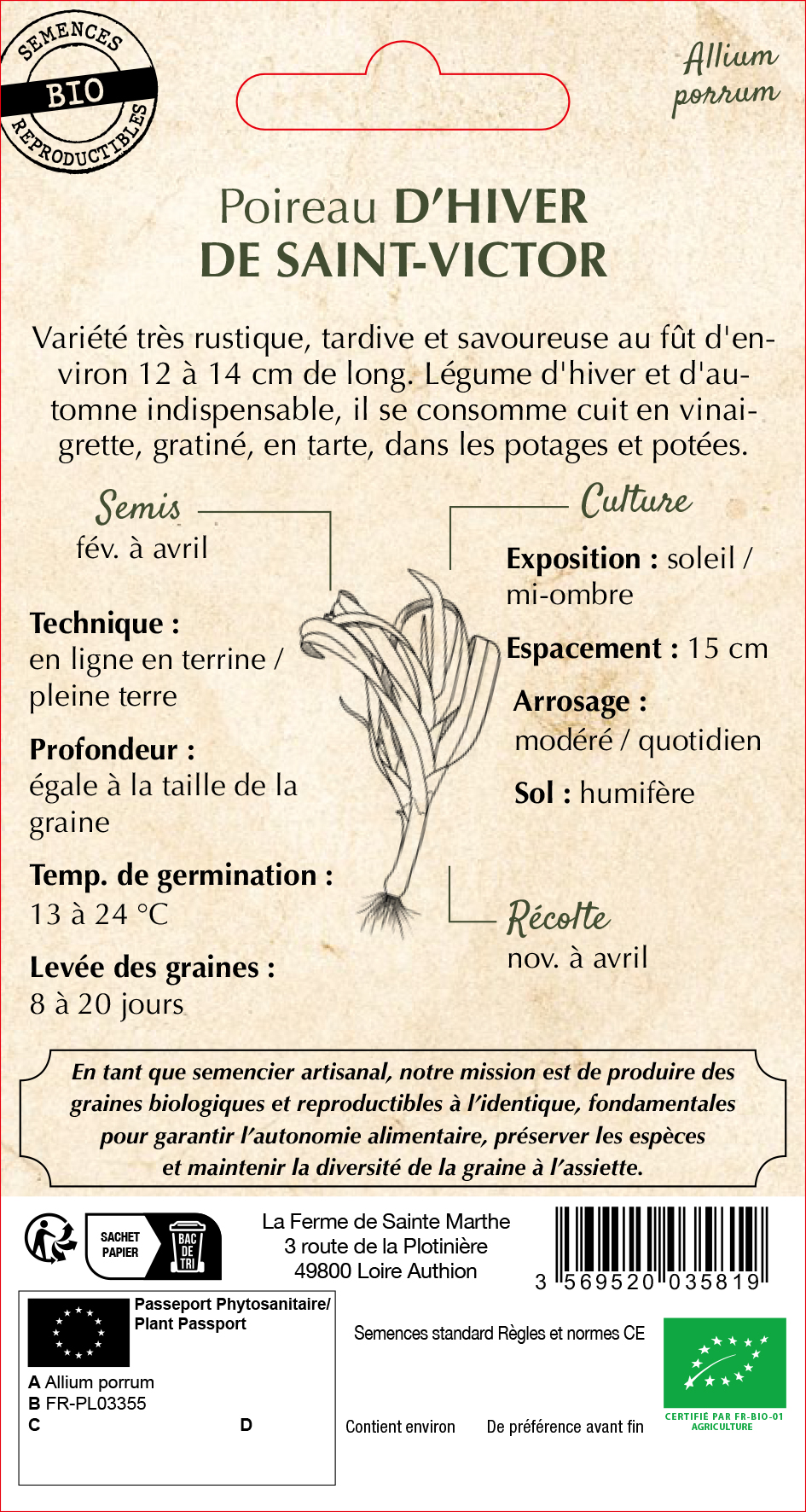 Découvrez le poireau d’hiver de Saint-Victor, variété rustique et tardive offrant un fût de 12-14 cm. Récolté de novembre à avril, ce légume d’automne et d’hiver délicieux se déguste en vinaigrette, gratinée, en tarte ou en potage.
