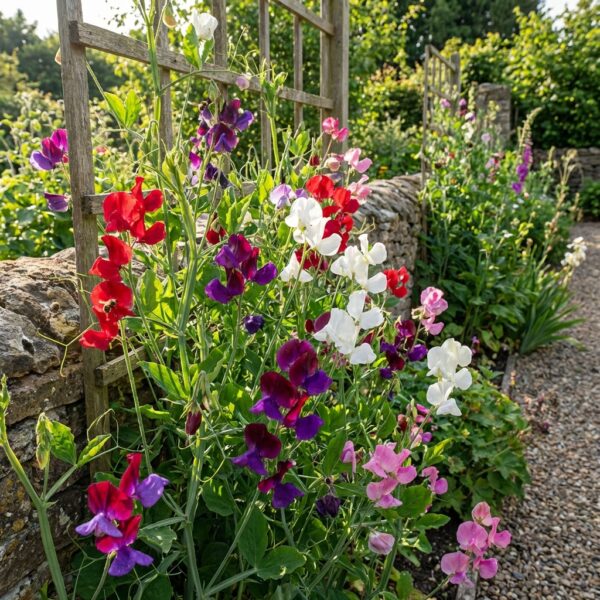 Variété grimpante spectaculaire de POIS DE SENTEUR aux coloris variés : rose, mauve et bleu. Ses longues tiges atteignent 2 mètres de hauteur. Parfait en bordure de palissade et en bouquet. 50 graines incluses.