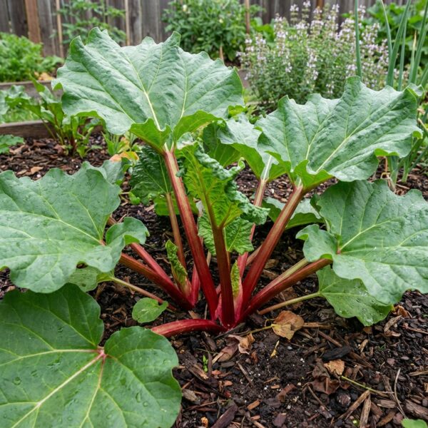 La Rhubarbe Victoria est une plante vivace exceptionnelle, prisée des jardiniers pour ses côtes rouges charnues et épaisses. Cette variété robuste se distingue par son feuillage dense et volumineux qui disparaît naturellement en hiver avant de réapparaître spectaculairement au printemps.