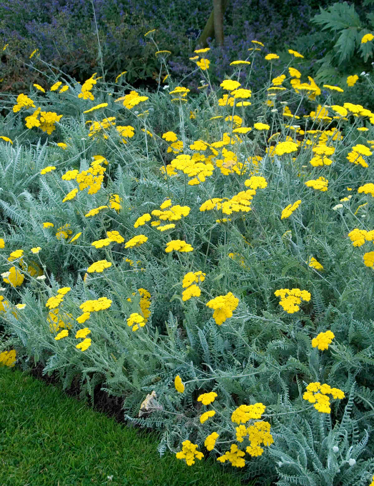 Par son feuillage argenté et sa floraison estivale jaune éclatant, cette achillée structure naturellement les massifs. Elle crée un contraste intéressant avec les vivaces bleues ou violettes, mais aussi avec les feuillages gris ou pourpre.